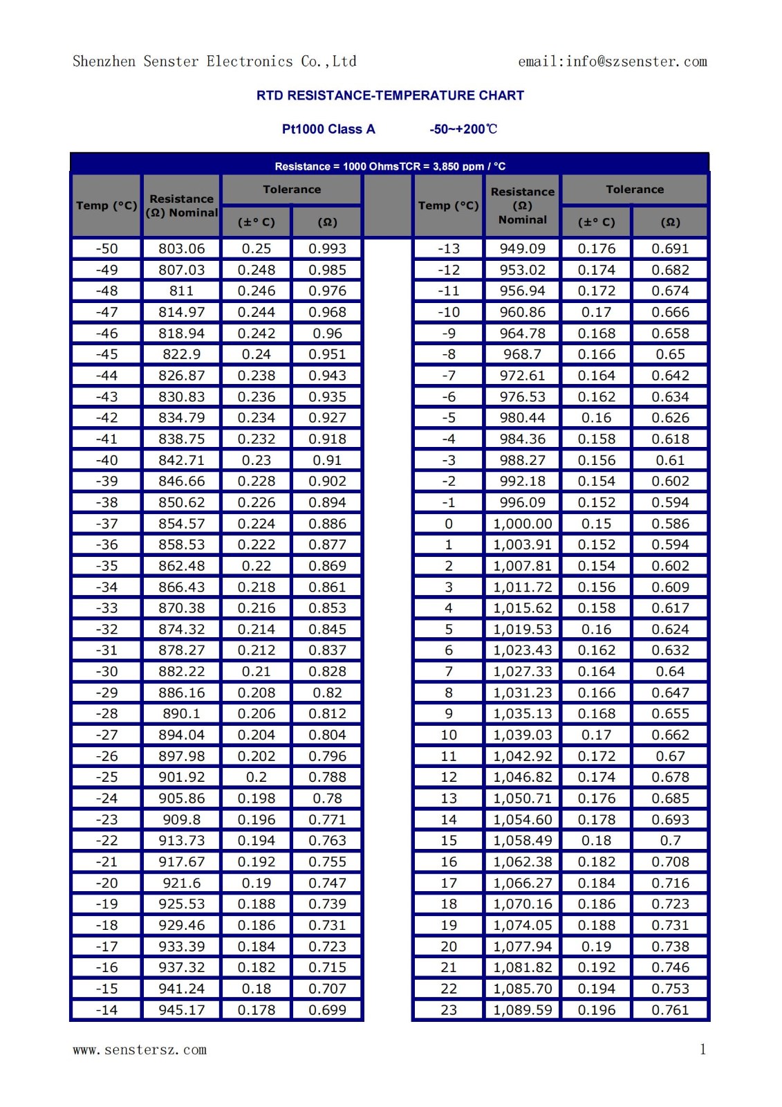 PT1000 RTD RTD Resistance-Temperature-Chart -50~+200℃